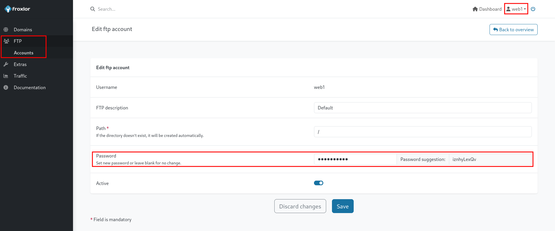 Knowing the password allows me to login as web1 and I can find another account for FTP with the same username. I proceed to reset the password there as well.